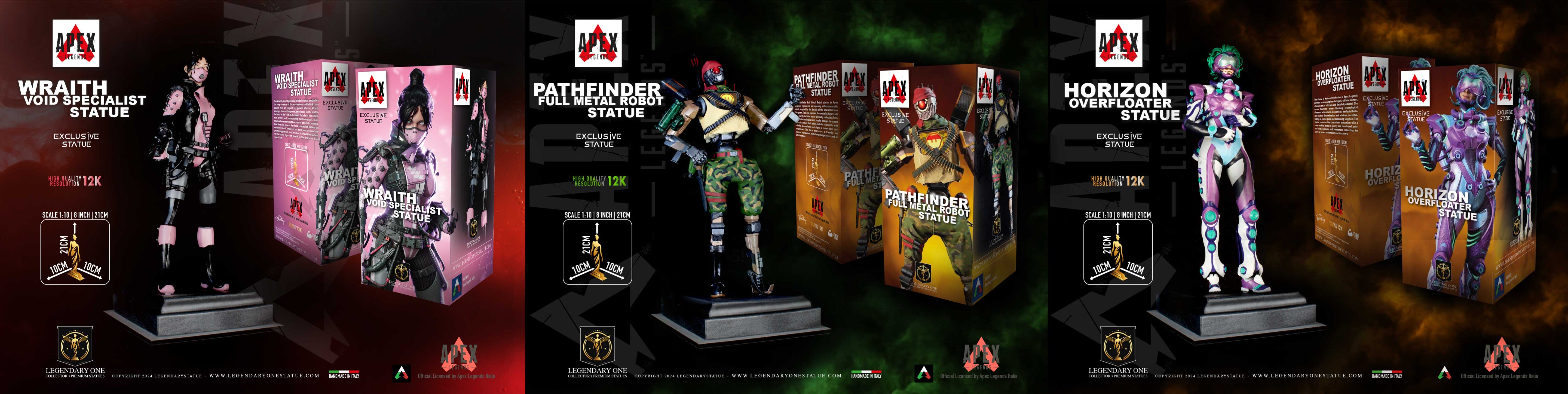 Le esclusive statue da collezione premium di Apex Legends sono finalmente disponibili! Le versioni esclusive Void Legends di Wraith, Full Metal Robot di Pathfinder ed OverFloater di Horizon sono ora acquistabili, tutte con licenza ufficiale Apex Legends Italia. Queste statue rappresentano le stesse edizioni numerate a partire dal "N.01/100" vinte dai tre campioni del Torneo Apex Legends Italia Battle Royal 2024. Non perdere l’occasione di aggiungere una di queste esclusive Apex Legends alla tua collezione!