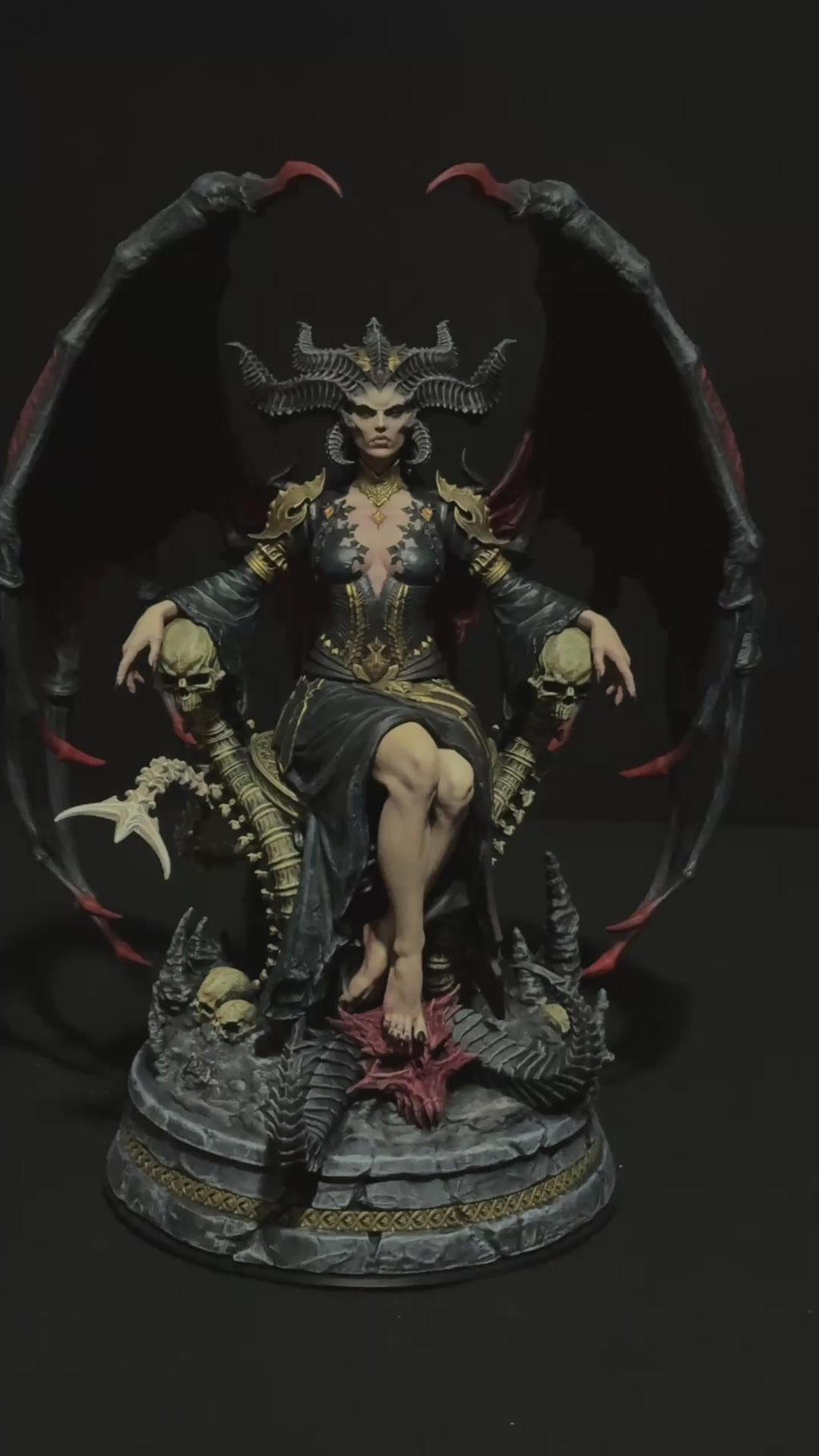 La composizione la ritrae seduta su un trono organico scolpito tra ossa, vertebre e teschi, in una posa regale e dominante. Le ali demoniache, ampie e strutturate, incorniciano la figura creando una silhouette scenografica di forte impatto visivo.