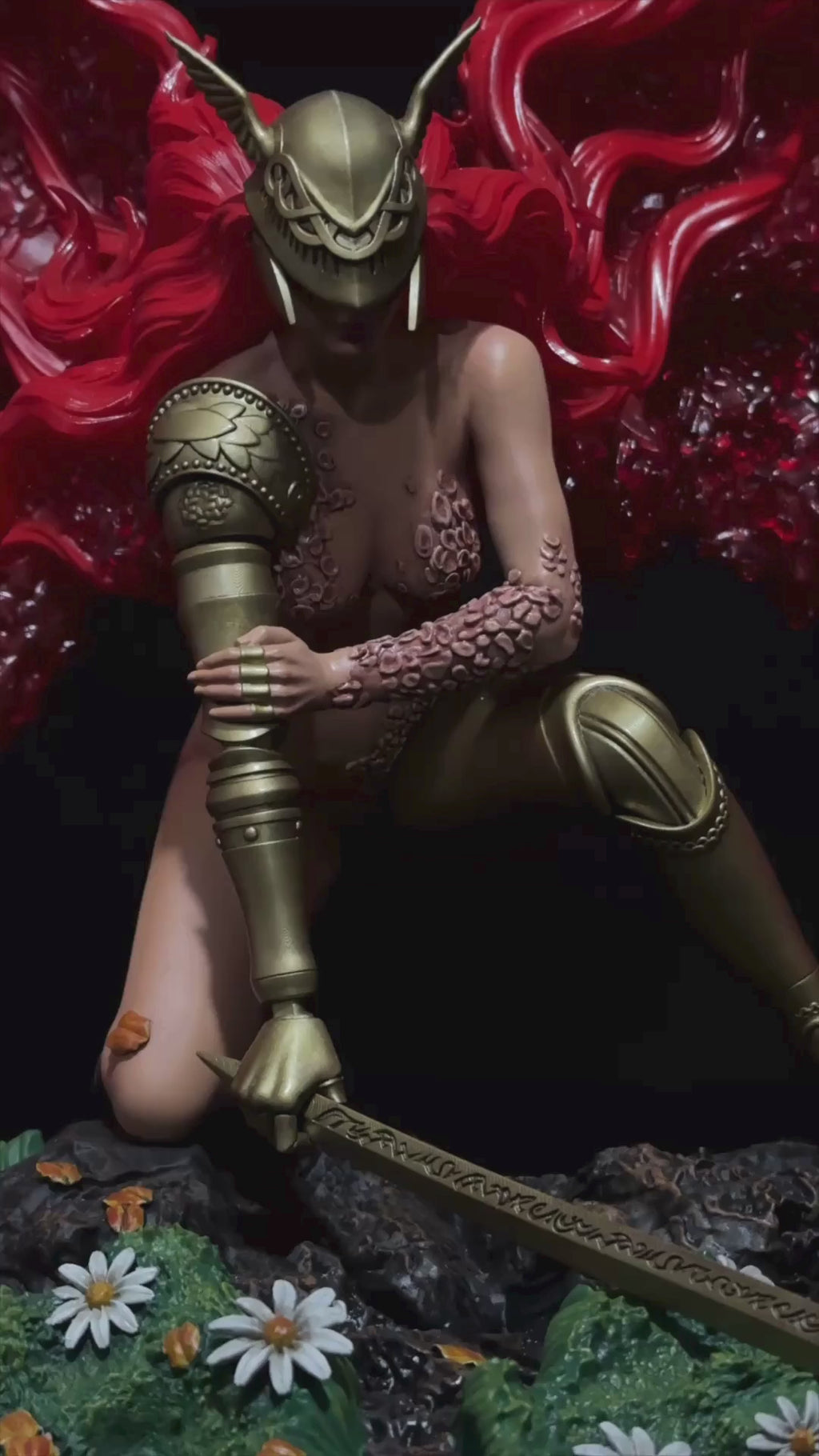 La posa raccolta e pronta all’attacco, la spada incisa e la base naturale con fiori e petali in contrasto con la brutalità del soggetto completano una composizione altamente cinematografica.