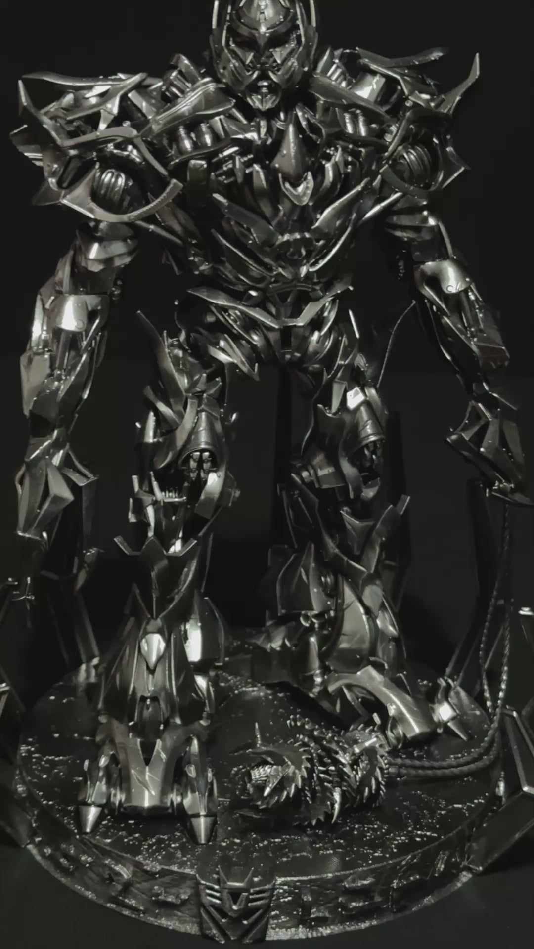 La colorazione accurata e i dettagli dipinti a mano rendono Megatron un capolavoro. Le tonalità metalliche e i riflessi realistici enfatizzano ogni elemento della sua struttura, conferendo un aspetto vivido e cinematografico.